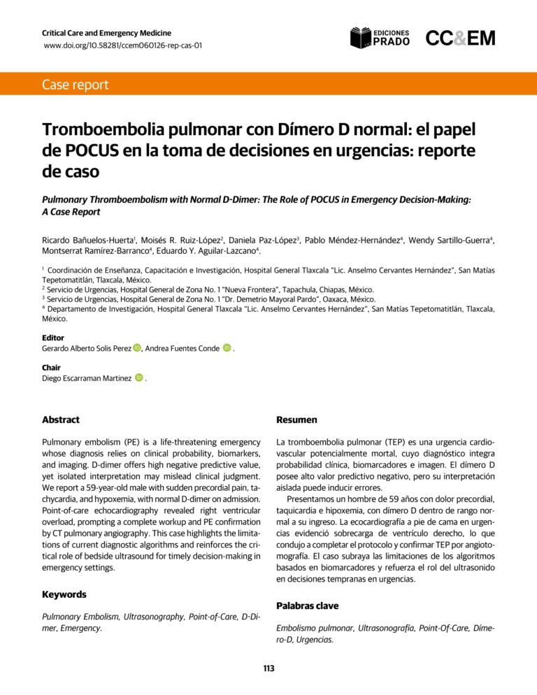 [1] Ricardo Bañuelos-Huerta, Moisés R. Ruiz-López, Daniela Paz-López, Pablo Méndez-Hernández, Wendy Sartillo-Guerra, Montserrat Ramírez-Barranco, and Eduardo Y. Aguilar-Lazcano. 2026. Tromboembolia pulmonar con dímero D normal: el papel de POCUS en la toma de decisiones en urgencias: reporte de caso. CRITICAL CARE & EMERGENGY MEDICINE 5, (January 2026), 113–117. https://doi.org/10.58281/ccem060126-rep-cas-01